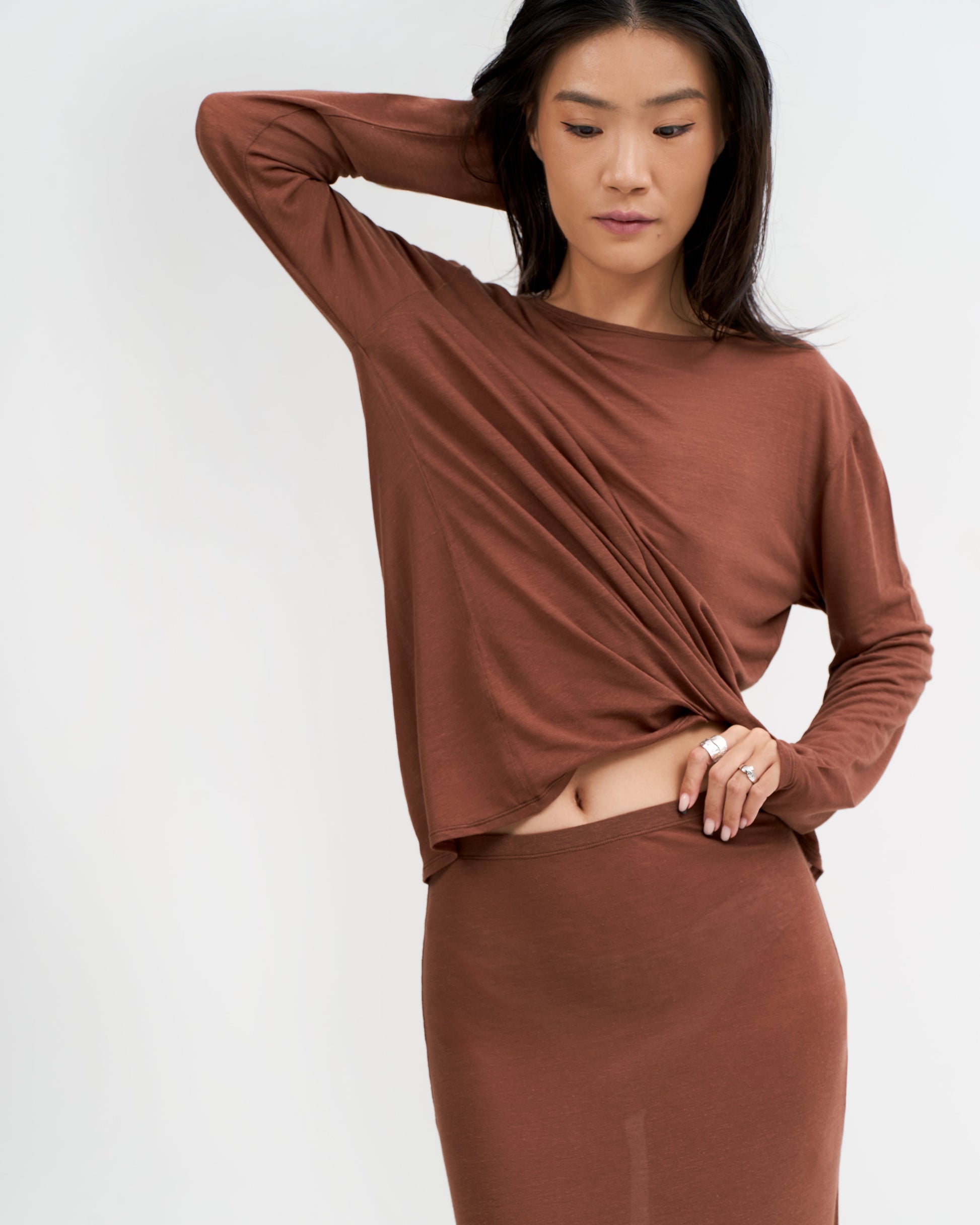 Long-sleeve top made from lightweight linen knit with Tencel. The semi-sheer fabric gently drapes over the body, highlighting natural lines and form. With its relaxed silhouette and fluid sleeves, it feels effortlessly airy and soft — perfect as a base layer or a subtle statement on its own.