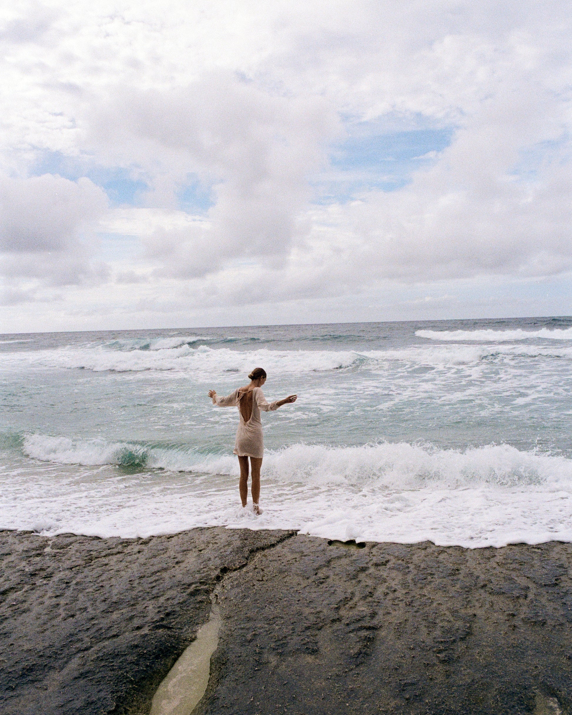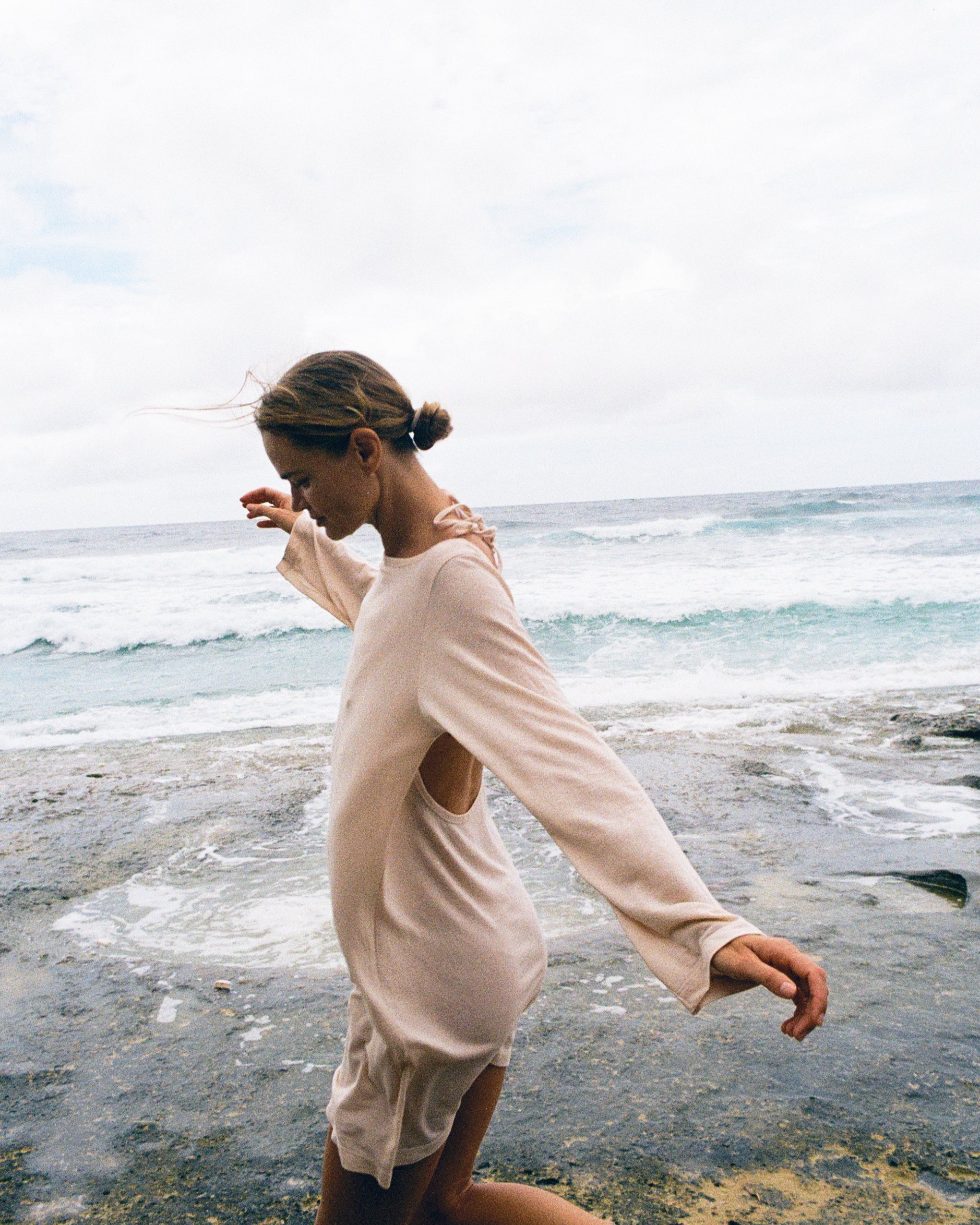 Mini long-sleeve dress made from lightweight linen knit with Tencel. The semi-sheer fabric feels soft on the skin and moves easily with the body. An open back with a tie detail adds a relaxed, effortless feel. Easy to wear on warm days — light, simple, and comfortable.