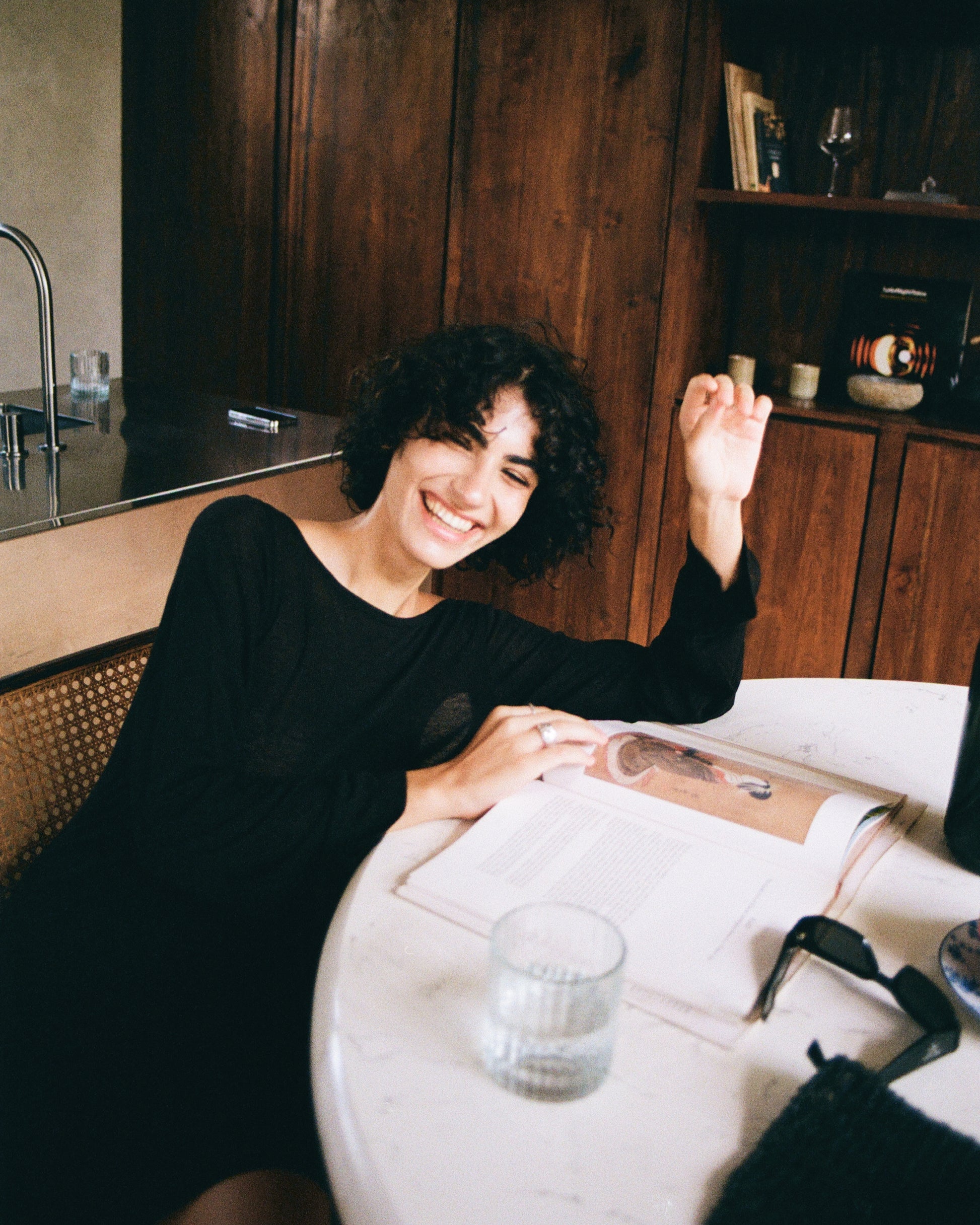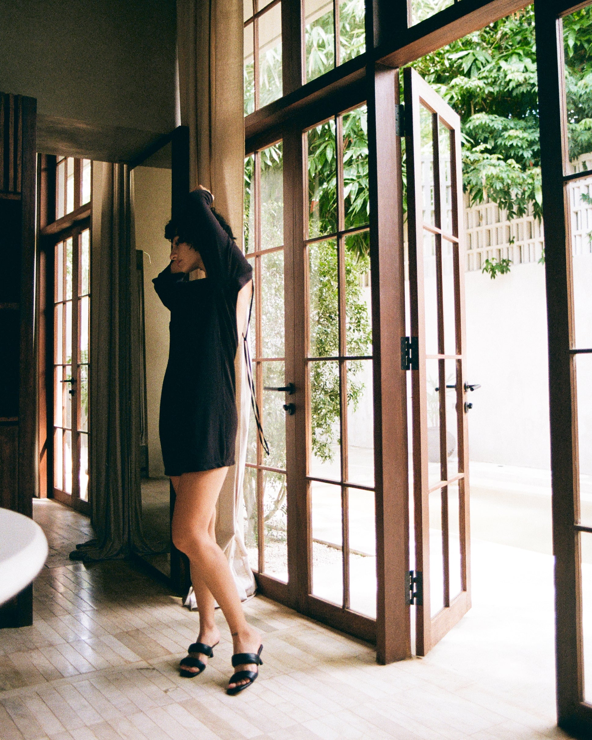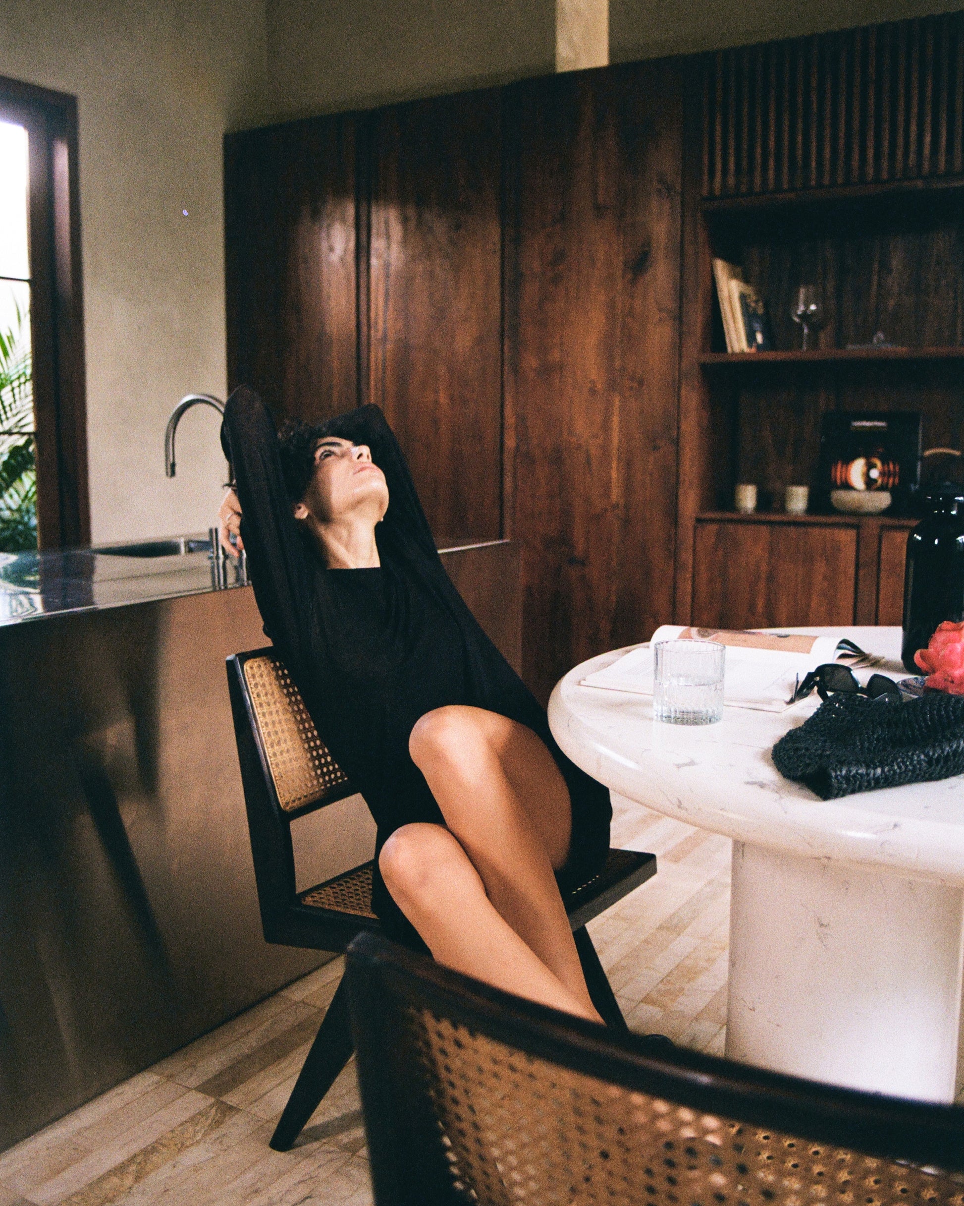 Mini long-sleeve dress made from lightweight linen knit with Tencel. The semi-sheer fabric feels soft on the skin and moves easily with the body. An open back with a tie detail adds a relaxed, effortless feel. Easy to wear on warm days — light, simple, and comfortable.